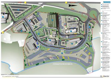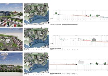 The design approach prioritises the responsible use of the existing site characteristics. The HGV lorry park is specifically located in an area above the Bessbrook River floodplain, and critically, site levels will not be raised, ensuring that the natural flood storage capacity of the area is fully maintained. Existing mature trees along the riverbank will be retained, providing important natural screening and visual amenity. Recognizing the site's previous institutional use and its location bordering the A1 and the established urban edge of Newry, the development aims to repurpose land that currently offers limited countryside amenity. Access will be managed via the existing entrance on the A28 Armagh Road and the new link road connection, designed to Department for Infrastructure (DfI) Roads standards. The existing graveyard located within the site boundaries will be respectfully preserved and maintained